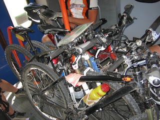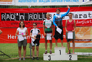 Sonst gab es nichts spektakuläres, es ging halt auf Waldautobahnen hoch und runter - also gar nicht meins, denn es gab nichts technisches :-( Als ich in die zweite Runde abbog war ich sehr froh, dass ich mich doch "nur" für die 50km entschieden habe, denn ich hatte keine richtige Lust mehr. Am Ende der 2ten Runde ging es schon wieder etwas besser, doch ich freute mich nun gen Ziel zu rollen. Kurz vor dem Ziel gab es nochmal einen kleinen aufgeschütteten Berg - der war schön :-) Es ging kurz steil hoch und am anderen Ende nochmal steil bergab (hier entschied Basti übrigens das Rennen für sich). Im Ziel warteten dann alle auf mich, wir gingen fix KALT (hihi) duschen und anschließend zur Siegerehrung. Dass ich als "6te" auch noch mit aufgerufen wurde, kam ziemlich überraschend. Eigentlich hielt ich doch schon fast das Scotti, damit der Basti aufs Treppchen steigen kann... Umso mehr freute ich mich dann über eine Flasche Fahrradshampoo (wenn ich es so nennen darf)...