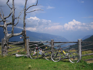Nachdem wir Christins Auto unter der Europabrücke geparkt haben, zogen wir uns allmählich an. Wir hatten eigentlich gutes bestellt und wollten bei dem vorherrschenden Regen einfach nicht starten. Doch so langsam bekam Petrus mit, das wir nun losfahren wollten und sorgte - zumindest von oben - für Trockenheit. Gegen 11Uhr starteten wir also unseren Alpencross. Am ersten Tag fuhren wir über die Sattelalm zur Brenner Grenzkammstraße. Kurz nach der Sattelalm jedoch, war der Forstweg gesperrt und wir entschieden uns den "Mountainbike-Schiebeweg" zu nehmen. Irgendwie fanden wir im totalen Nebel trotzdem den Weg zum Brennergrenzkamm, wenn auch mit 90% Schieben :-( Im Nachhinein erfuhren wir, dass genau auf diesem Forstweg immer der böse Bauer mit Mistgabel und Hund auf die MTBiker wartet um sie zu bedrohen etc. (zwar hatten wir von dem schonmal gehört, aber dass unsere Route durch sein Grundstück führen sollte, wussten wir halt nicht).